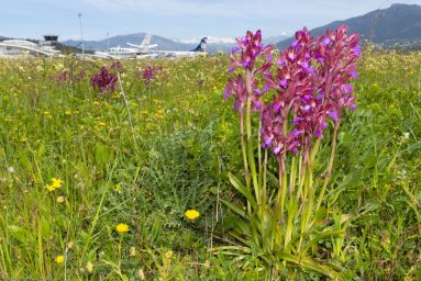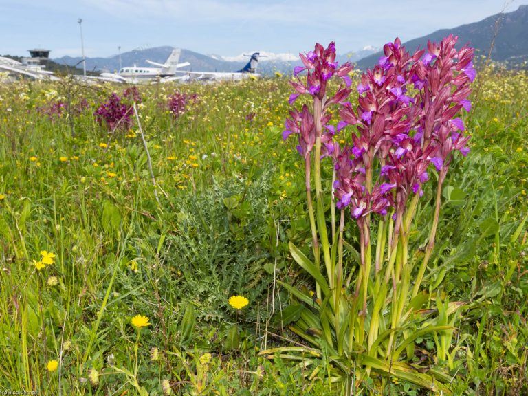 L’aéroport d’Ajaccio Napoléon Bonaparte présente une grande diversité d’habitats, notamment grâce à sa situation géographique, à l’embouchure de la Gravonne et du Prunelli au fond du Golfe d’Ajaccio. Il montre ainsi des végétations littorales bien préservées à son extrémité sud, y compris des zones de fruticée à Genêt de Salzmann, puis différents types de prairies riches en orchidées au printemps, ainsi qu’une rare lande à lichens Cladonia et un boisement de chênes-lièges. Cette variété d’habitats et leur bon état de préservation en font un lieu d’observation de biodiversité ordinaire toujours renouvelé. 273 espèces de plantes et 87 espèces d’oiseaux ont été comptabilisées entre 2016 et 2020.
